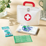 薄型のジッパーポーチに、水に流せるペーパー、アルコール除菌ジェル、絆創膏が入っています。